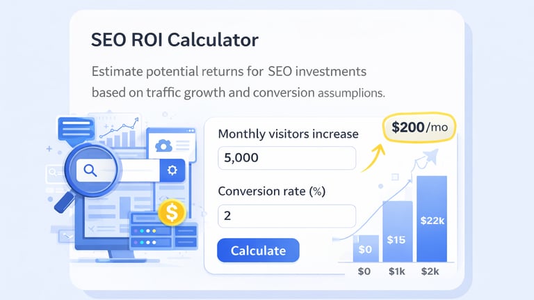 Estimate potential returns from SEO investments based on traffic growth and conversion assumptions.